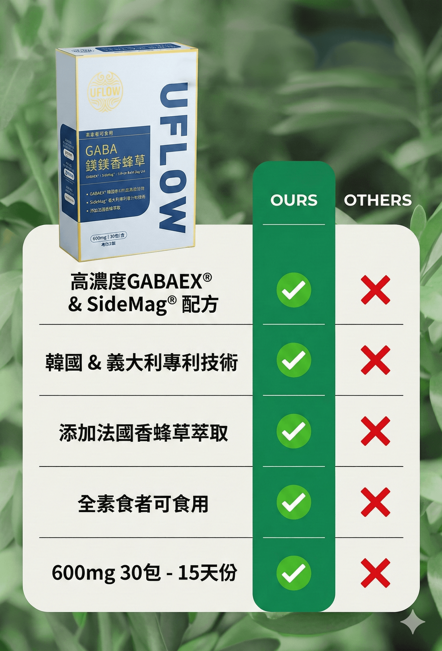 - 法國香蜂草萃取 (200mg):100%純天然萃取,鎮靜助眠,情緒穩定 。